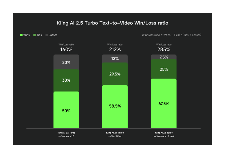 Kuaishou’s announcement includes reported win‑loss ratios from blind human preference tests. The company states that in text‑to‑video evaluation, Kling v2.5 Turbo Pro achieved win‑loss ratios of 285%, 212%, and 160% against Seedance 1.0 mini, Veo 3 fast, and Seedance 1.0, respectively. In image‑to‑video evaluation, the reported win‑loss ratios are 208%, 289%, and 164% against the same competitors. These numbers are presented as company‑reported results, so they should be interpreted as internal benchmarking rather than independent verification.
